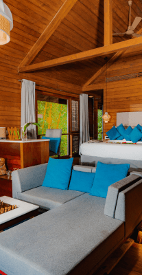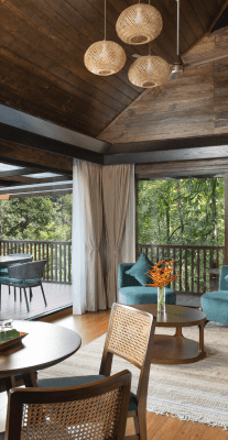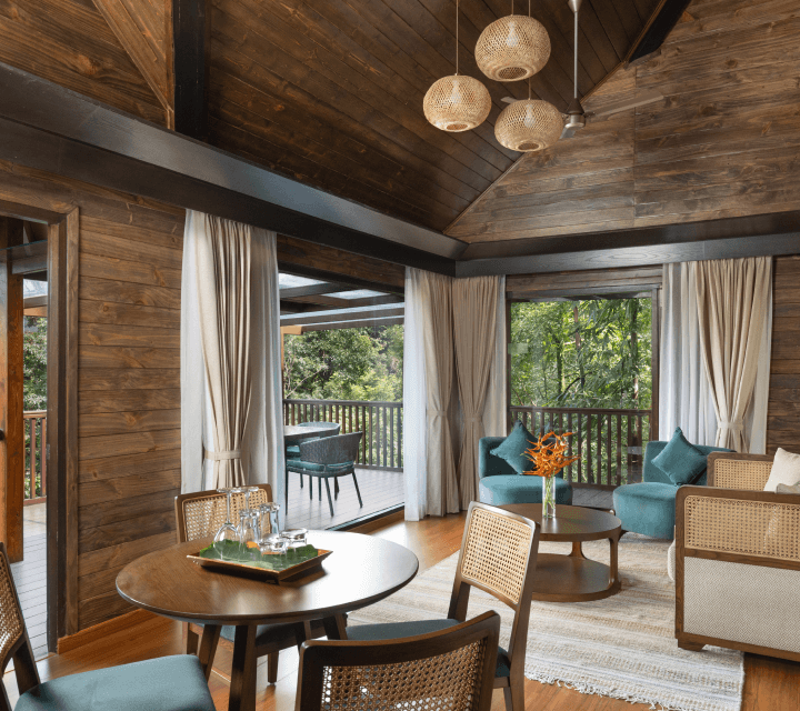 At The Tamara Coorg, every stay is an invitation to experience refined luxury in perfect harmony with nature. Nestled amidst 184 acres of coffee plantation, our 56 elegantly designed cottages are elevated on stilts to preserve the natural terrain and crafted from warm Canadian Spruce wood. Featuring detailed rafter work and rich wooden interiors, each cottage is a private sanctuary—thoughtfully designed to offer both architectural beauty and luxurious comfort.