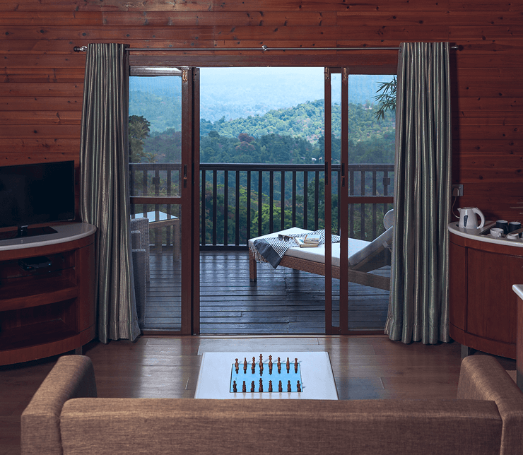 Our Luxury Cottages offer breathtaking views of the lush greenery surrounding the resort. Designed with subtle pastel tones, the interiors reflect the serenity of nature, while an elevated platform bed adds both lends an air of refined sophistication, while subtly amplifying the openness of the space.. Each cottage opens up to a private, sundeck — an idyllic space to relax and soak in the beauty of the landscape.